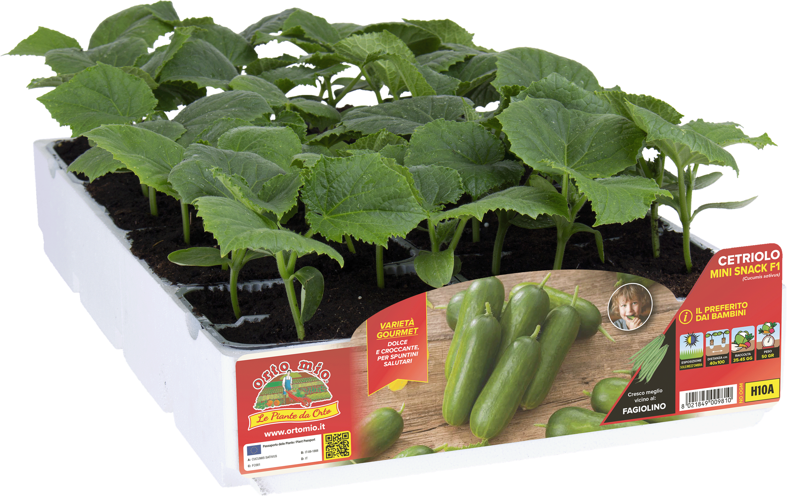 Nuova varietà di cetriolino snack di ottimo sapore, ideale per spuntini, antipasti e aperitivi. Adatto anche per succhi e centrifughe. Frutti perfettamente lisci di colore verde scuro molto brillante, di circa 70-80 grammi, con buona conservabilità dopo la raccolta. Ha pianta estremamente vigorosa che emette molti getti ascellari. La produttività è garantita dai numerosi fiori femminili, spesso in grappoli di 2-3 per nodo. Pianta per coltivazione sia in campo aperto che in serra. È poco suscettibile alle comuni patologie del cetriolo, agevolando la coltivazione biologica. Gradisce generosi apporti di sostanza organica. Raccogliere i frutti frequentemente, alla lunghezza di 8-10 cm. Naturalmente resistente a mal bianco e cladosporiosi.
